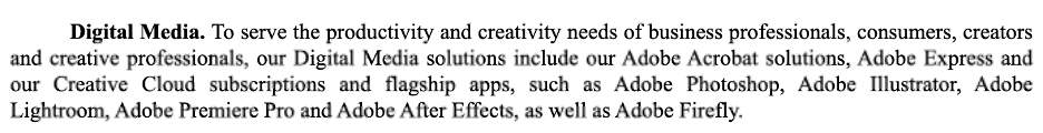 This segment includes their flagship apps like Adobe Photoshop, Illustrator, Lightroom, Premiere Pro, and Firefly.