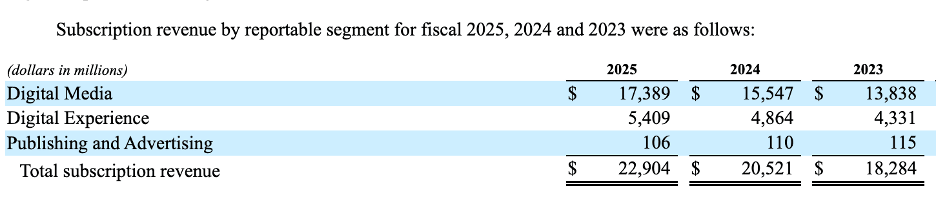 Last disclosed, in 2024 the “Creative” business was 80% of revenues ($12.7bn). and the Document Cloud was the other 20% ($3.2bn).