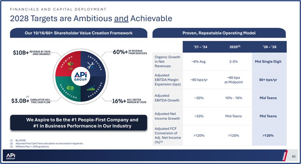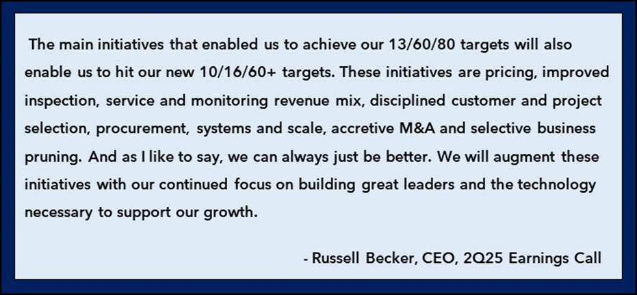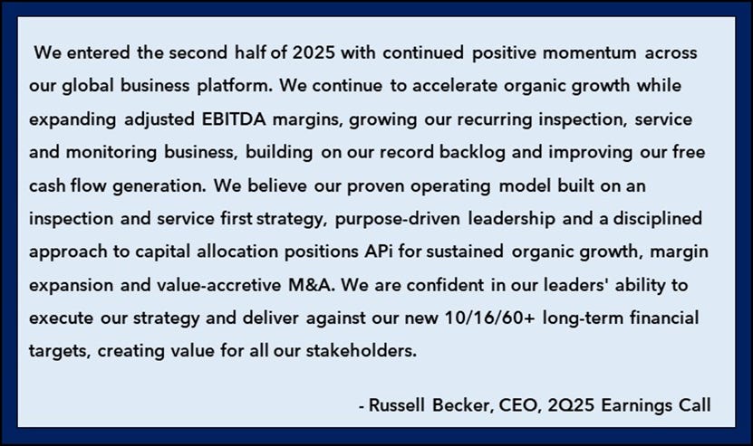 At the beginning of May they had an investor day and announced update long-term targets. Their 2028 targets are now called 10/16/60+. Their 2028 targets are 1) over $10bn in revenues, 2) 16%+ adjusted EBITDA margin, 3) 60%+ of revenues from inspections, services, & monitoring, and 4) over$3bn in cumulative adjusted free cash flow through 2028. They also added revenue growth would be supported by mid-single digit organic growth (so can’t be purely from acquisitions).