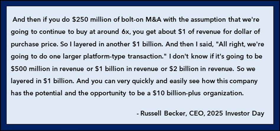 The markets they operate in are fairly fragmented with no large player having more than ~10% market share. They can be quite acquisitive but are very disciplined with their purchase prices. Right now they intend to deploy about $250mn a year in bolt-on M&A at mid-single digit EBITDA multiples.