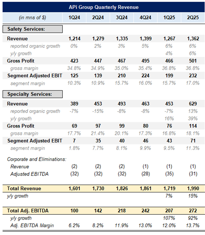 APG reported a strong 2Q25 with revenue growth accelerating +15% y/y, up from +7% last quarter. Organic growth was strong at +8% y/y versus +2% last Q. Within that, the more important safety services segment grew +5.6% y/y, which is in line with last quarter.