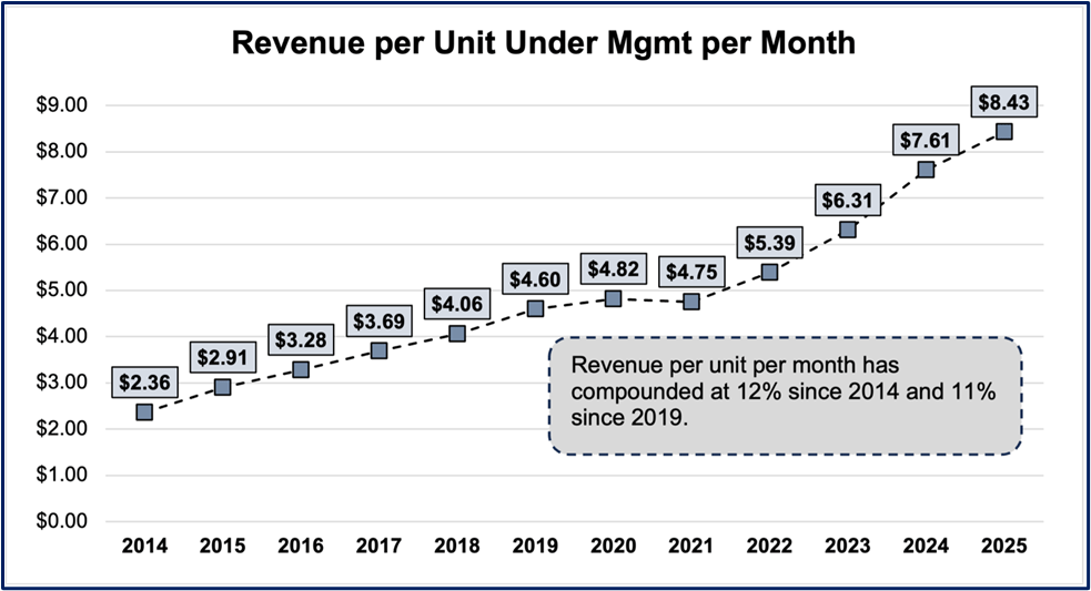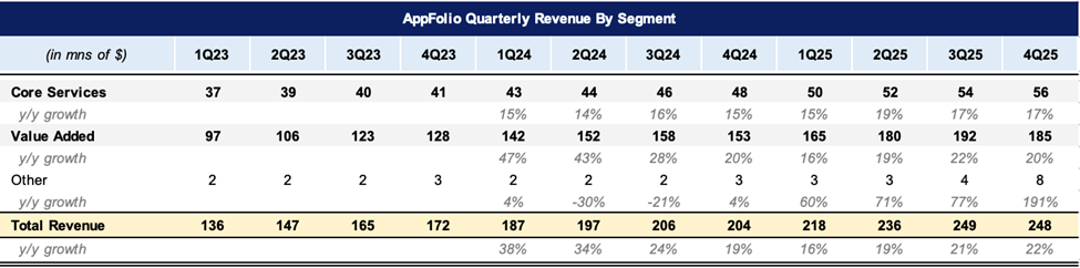 For full-year 2025, Core Services revenues accelerated 180bps to +17% y/y from 15% in 2024. (On the call, they noted that they are renaming this segment to “Subscription Service Revenues” going forward.) At the end of the year, AppFolio ended with 9.4mn units from 22,096 customers, which is up 8% y/y and 6%y/y, which is a reacceleration of 200bps from last year.