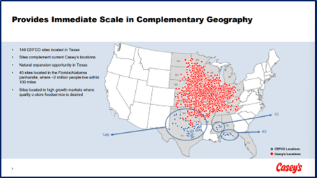 While there are several other large convenience store chains, most stick to a particular region with the exception of 7-Eleven who has a nation-wide presence. Other large chains include Circle K, which is owned by Aliment Couche Tard, and Speedway (which was acquired by 7-Eleven). For a sense of scale there are 13,000 7-Elevens, 9,200 Aliment Couche Tard-owned stores, and 3,000 Speedways in North American. Casey’s store count tallies to 2,900.