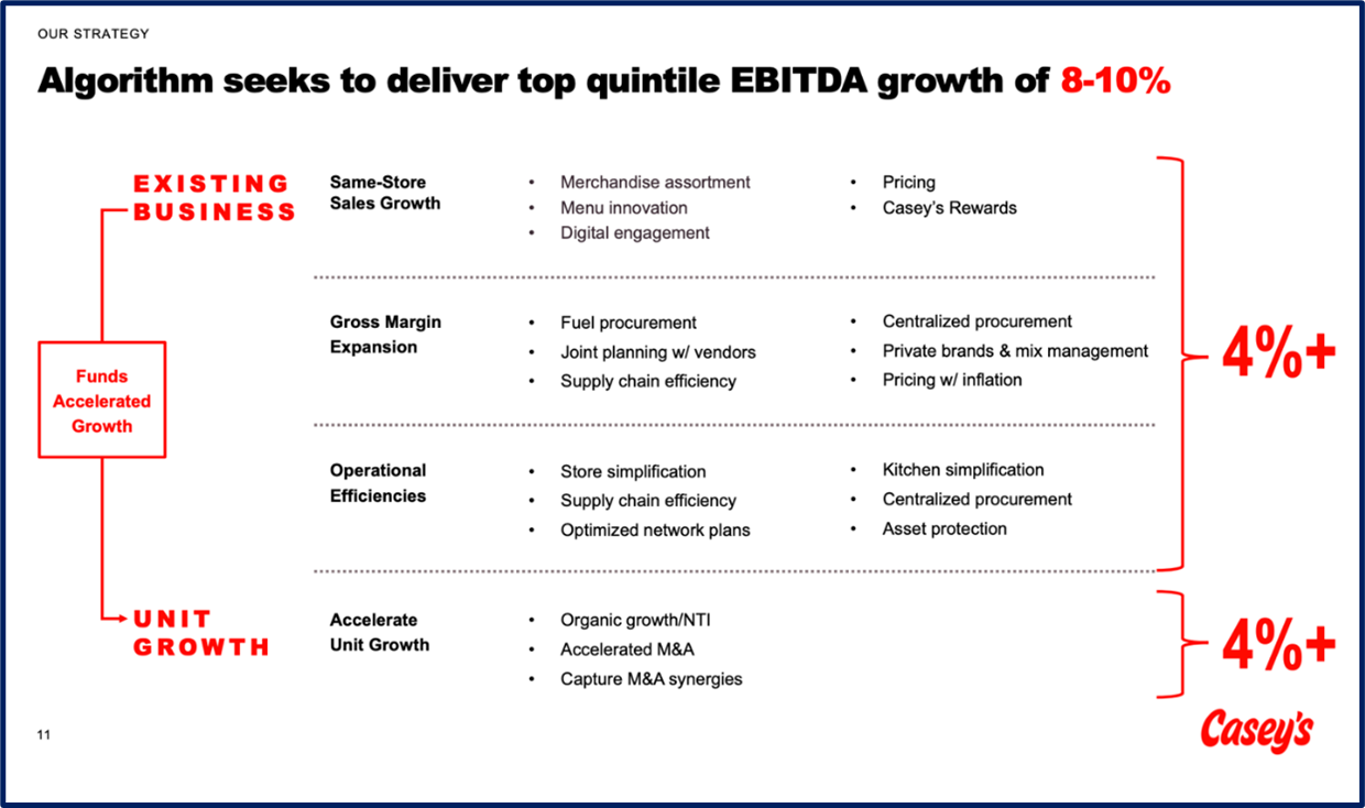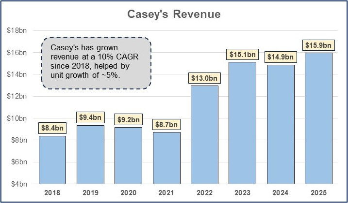 Today, Casey’s manages nearly ~2,900 stores across 20 states, serves over 9 million members in their loyalty program, is the 3rd largest convenience retailer, the 5th largest pizza retailer nationally, and generates over $16bn in revenues at a 5% operating margin.