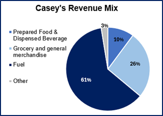 Casey’s breaks out revenues by 1) Prepared Food and beverage, 2) Grocery and General merchandise, 3) Fuel, and 4) Other. The other category includes car wash revenues and their wholesale fuel business (where they sell fuel to other gas stations).