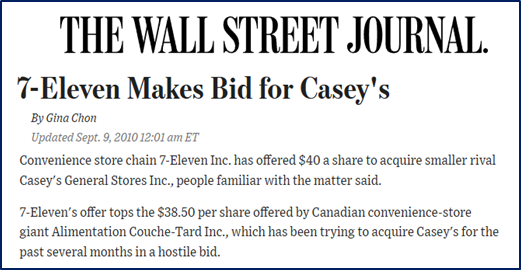 Their performance through the GFC attracted interest from other convenience store operators. In 2010, Casey’s was almost acquired by the much larger Canada-based convenience store chain Alimentation Couche-Tard. After Casey’s rebuffed the hostile $2bn offer from Alimentation Couche-Tard, Japan’s Seven & I Holdings, which owns 7-Eleven, stepped in. Seven & I Holding’s offer was also rejected. and Casey’s management raised a bond with a change of control provision that allowed the bondholders to redeem at a premium should there be a takeover to dissuade any further acquisition attempts. With their independence secured, Casey’s continued to acquire more units in the mid-west and lean into their prepared food offering.