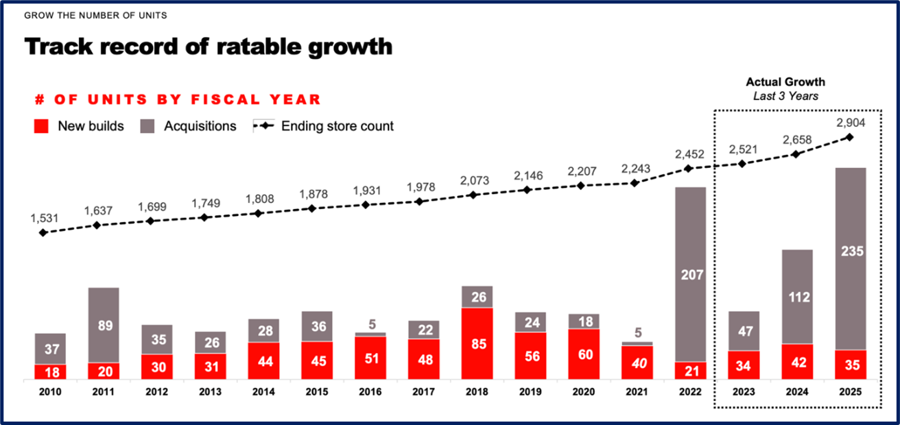 Since 2010, they have grown revenues at a ~12% CAGR and a ~11.5% CAGR since 2020. For 2025, revenues grew +7.3%, with same store sales from Food and Beverage growing Speedwellresearch.com 15 +3.5% and Grocery and General Merchandise growing +2.3%. Fuel sales were roughly flat. he rest of their growth has come from unit count, which was up +9% in 2025 (the full year of sales of acquired units isn’t included in 2025 figures though).