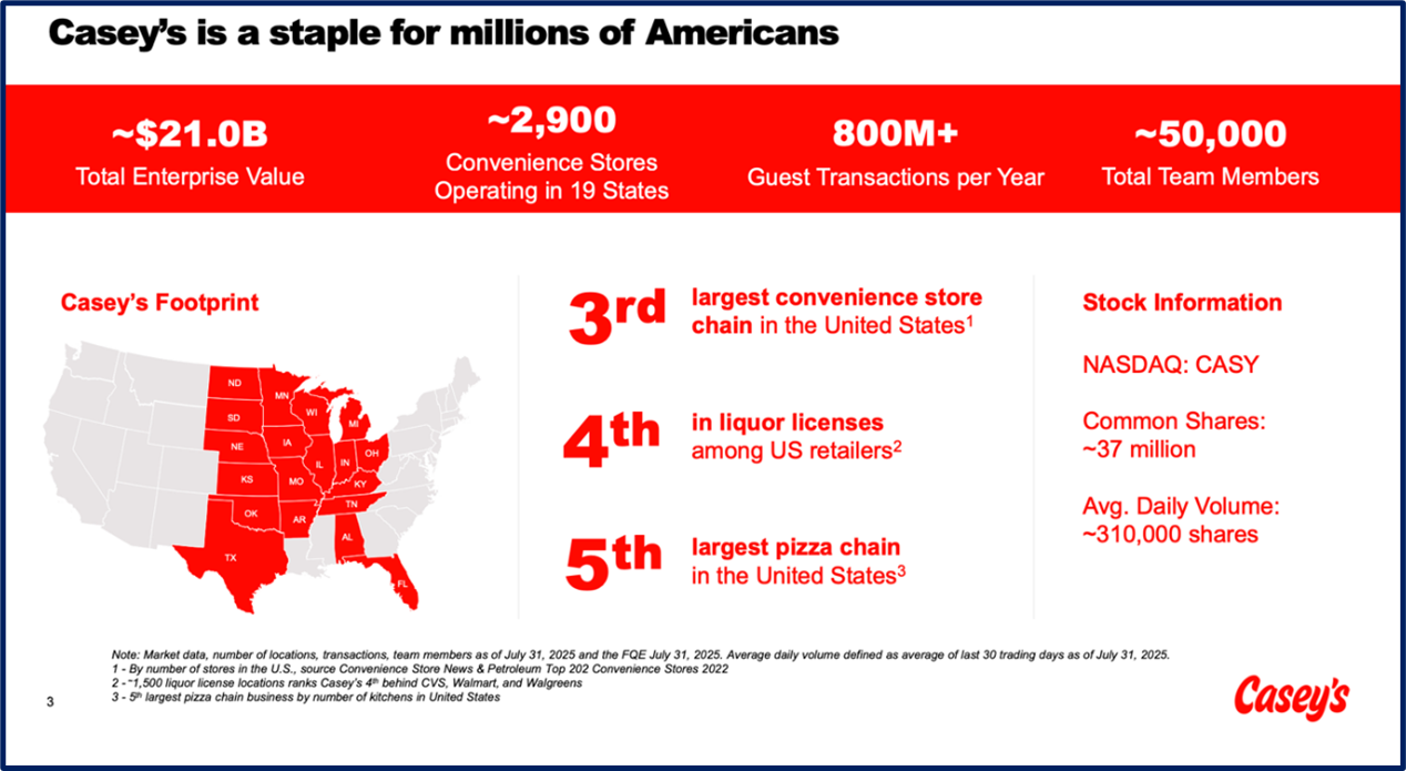 Casey’s General Stores operates convenience stores with gas stations throughout the mid-west with a presence in 20 states. Half of their ~2,900 store footprint is concentrated in Iowa, Missouri, and Illinois. Almost all their stores operate under the Casey’s brand except for some acquired stores. They operate 63 stores under the “GoodStop” name, 12 under “Lone Star Food Store”, and 198 under CEFCO (from the recent Fikes acquisition). Casey’s is the 3rd largest convenience store chain, the 4th largest liquor license holder, and the 5th largest Pizza chain in the United States.
