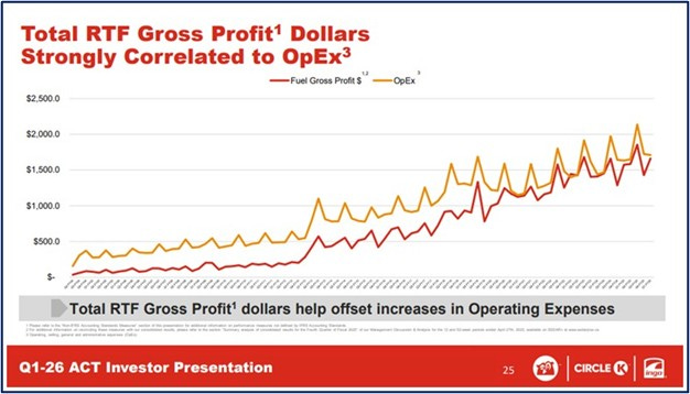 Fuel gross margins have improved over the past couple years for a few reasons. The first is that there was labor inflation and smaller mom and pop gas stations had to raise fuel prices to expand their fuel gross profits to offset an increase in labor costs. The slide below from Aliment Couch-Tard seems to corroborate that as they note the correlation between operating expense growth and fuel gross profit growth