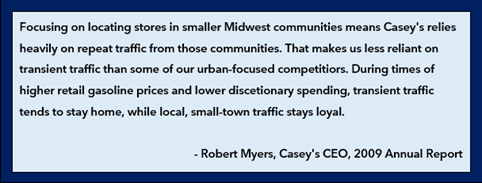 In 2009, while most American businesses were suffering due to the Great Financial Crisis, Casey’s was showing its resiliency. Its core philosophy of “Small Community Focus” and “Emphasize Food Service” was holding up well in small towns. Rather than being dependent on transient traffic, as many gas station/ convenience store combos are, Casey’s focuses on catering to the locals within an individual town. This means a higher rate of repeat purchases from the same customers and less dependence on road travel for sales. (Road travel tends to drop in tough economic times as people take fewer road trips). The fact that local consumers had few other alternatives and Casey’s offerings (including food) were already low-priced, meant that there was nothing to trade down to. Same-store sales increased +6.7% and margins improved.