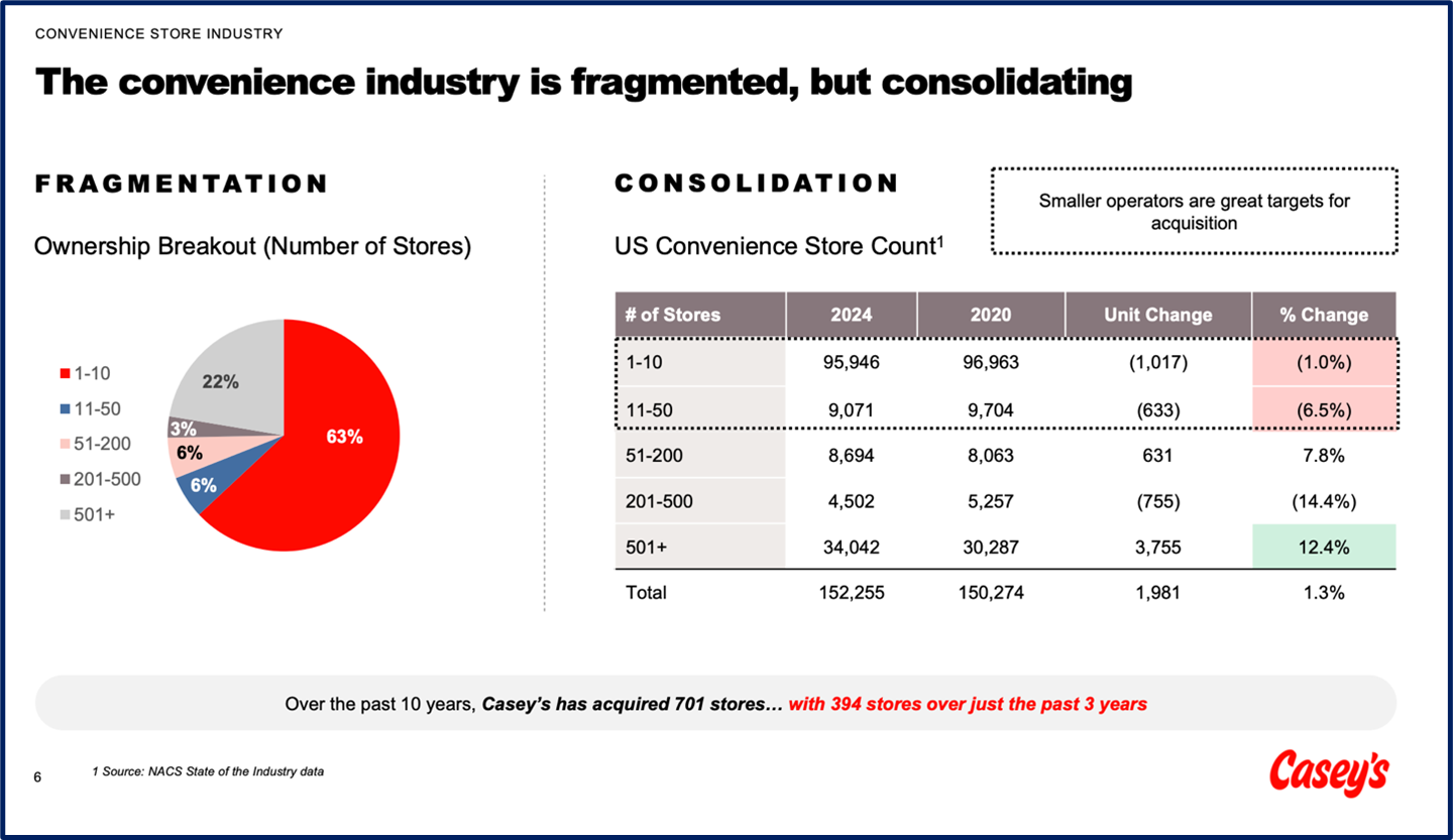 The convenience store industry is very fragmented, with 63% of stores owned by operators who run 10 or fewer stores. This suggest both an opportunity to acquire these small operators, but also that the majority of the competition set doesn’t benefit from scale or professional management.