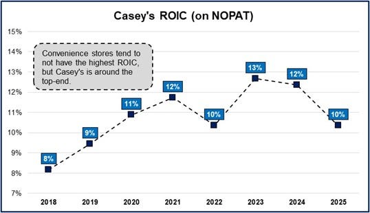 This makes most convenience stores fairly average businesses. The competition and lack of strong differentiation makes it hard to have an outsized ROIC, as competitors can (and do) literally pop up across the street to steal business. Alimentation Couche-Tard has a ROIC of about 11%, and Seven & i Holdings, owner of 7-Eleven, is closer to 5%. While this is a meaningful range, 11% is right around the edge of mediocre and 5% is dreadful. Casey’s is at the higher end, averaging 11% since 2020.