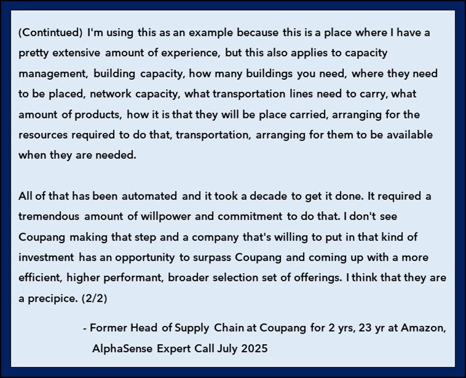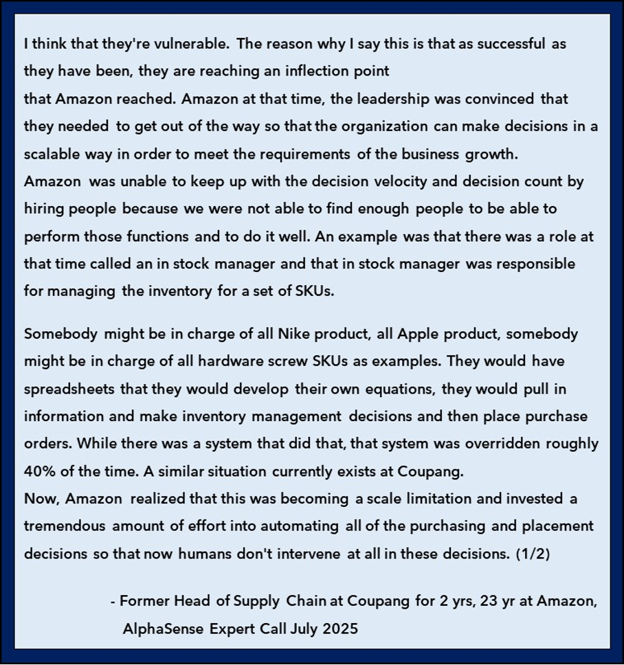 However, a former employee who spent 2 years as a Head of Supply Chain at Coupang after spending 23 years at Amazon was much more pessimistic on their ability to automate more of their back-end systems. As an example, he noted that a lot of procurement was still done manually and there was internal resistance to changing.