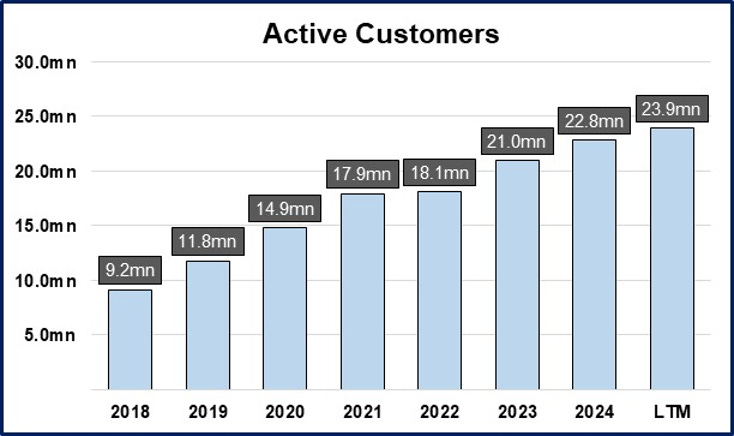 Active customers grew +10% y/y to 23.9mn. For context, South Korea has a population of about 51mn and about 23mn households.