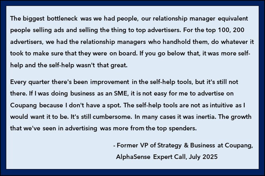 There are certainty plenty of places that Coupang can improve on though. Among which is their advertising self-service tools. As the expert below notes, a lot of advertising still relies on relationship managers, which is inherently unscalable. Unlocking advertising from SMEs will help increase bid density and inventory for their advertising offering. This will improve their ad revenues, while also allowing them to show more appropriate ads to consumers (because of the larger pool of inventory to pick from).