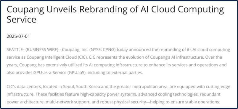 There is potential for a new offering: cloud computing. They released a press release at the beginning of the month that they rebranded their cloud computing service to Coupang Intelligent Cloud.