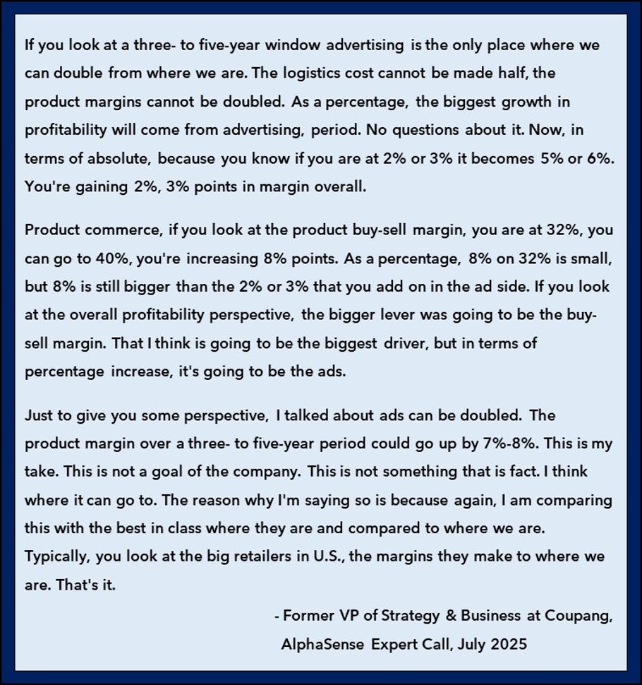 Despite already achieving 9% adjusted EBITDA margins in their Product Commerce segment, they have the opportunity to materially improve margins. In an AlphaSense expert call from earlier this month, the Former VP of Strategy & Business at Coupang believed Coupang could improve margins from advertising and gross margins expansion. (Free trial link).