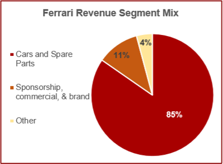 Ferrari has three revenue segments: 1) Cars and Spare Parts, 2) Sponsorship, Commercial, & Brand, and 3) Other.