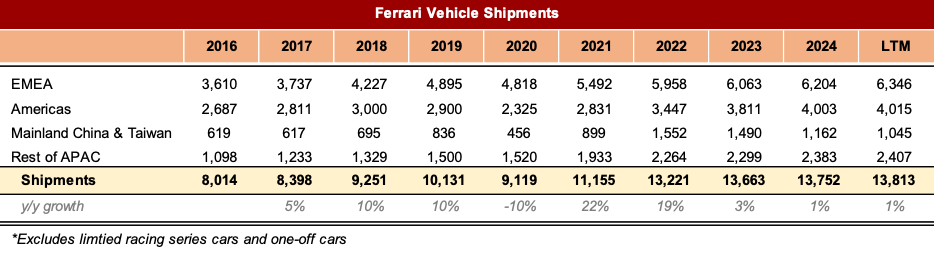 Ferrari is a leading luxury car manufacturer based in Maranello, Italy. They manufacture vehicles in-house and primarily sell them to their authorized dealership network, who then in turn sell the vehicles to the end customer. There are some exceptions for one-off special cars and track cars, which they sell directly to the end customer. At the end of 2024, their network comprised of 180 dealers who operated 200 points of sale. Ferrari does not own any dealerships, but they do have strict selection of dealers to ensure high service levels.