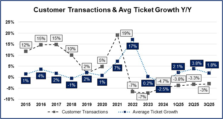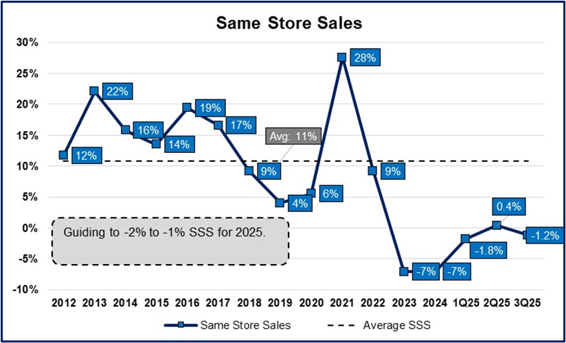 Revenue increased +5.5% y/y, while comparable sales decreased -1.2%. As a reminder, they signaled last quarter that their comps turned negative after the tariffs were enacted, which ended a very brief period of positive same store sales growth. (If you recall, tariffs delayed rate cut expectations which has the downstream effect of weighing on existing home sales). Unfortunately, same store sales (SSS) got worse as the quarter went on with September down -2.2%. For 4Q SSS are trending down -2% so far.