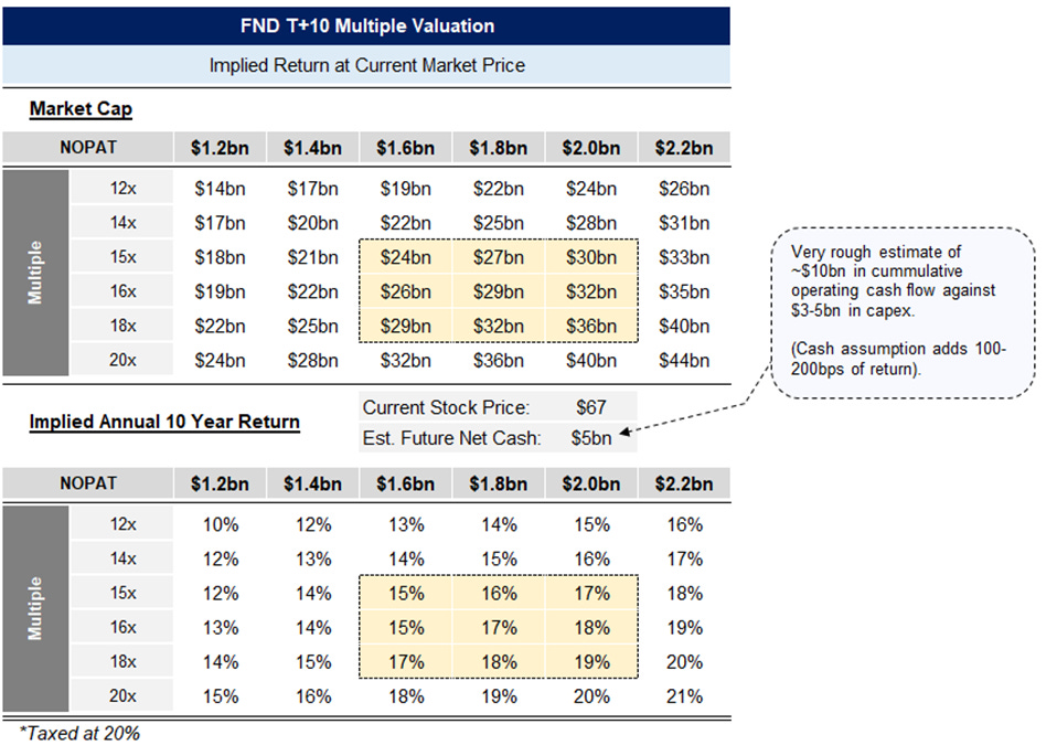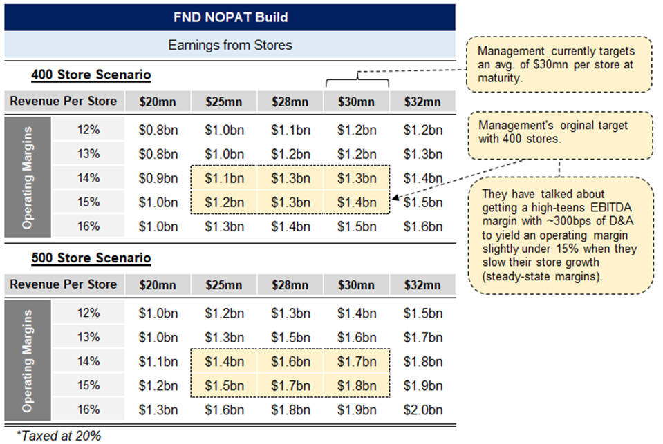 Floor & Decor has a target of 500 stores and prior commentary suggested that a store could do $30mn at maturity. Even if that was an extrapolation from a time of elevated activity, today’s 1st year stores are only doing $3-5mn less. If you assume the ramifications of that is that mature stores will also be impacted similarly, then you get $25mn in sales for a mature store. At a mature company margin of 15%, that is $1.5bn in earnings against a current market cap of $7.3bn.