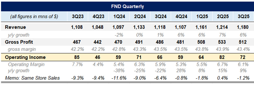 FND reported 3Q25 and the stock was up +6% after hours.