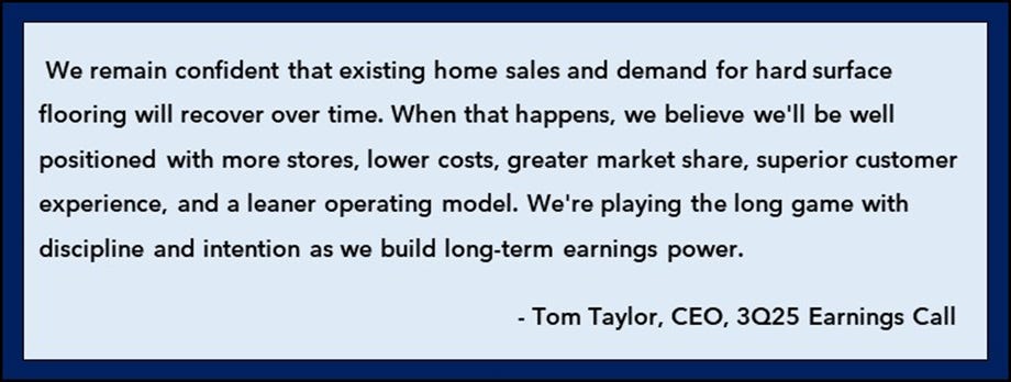 - “We remain confident that existing home sales and demand for hard surface flooring will recover over time. When that happens, we believe we’ll be well positioned with more stores, lower costs, greater market share, superior customer service, and a leaner operating model. We’re playing the long game with discipline and intention as we build long-term earnings power.”