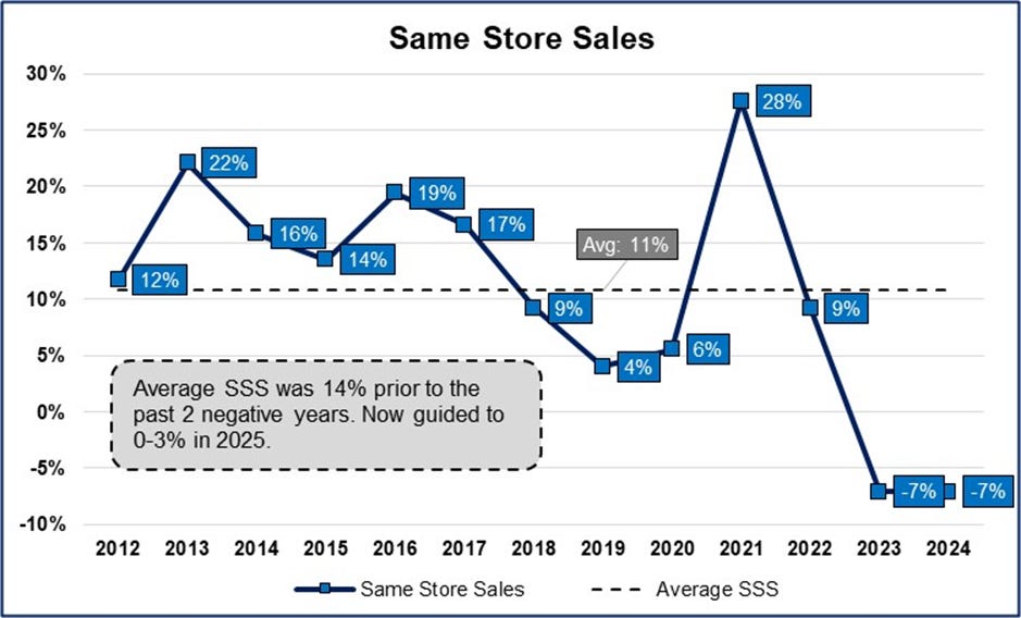 Since 2020, and including the last two years of -7% growth, SSS grew at a 5% CAGR. While this isn’t horrible, it is much lower than their average since 2012 of 11% (which was 14% prior to inclusion of the last two years). As a reminder, strong historical SSS was the result of new stores ramping up and was always going to fall as the ratio of new to mature stores tilted heavier to slower-growing mature stores. Nevertheless, the slowdown was much starker than expected.
