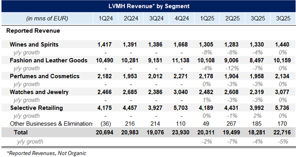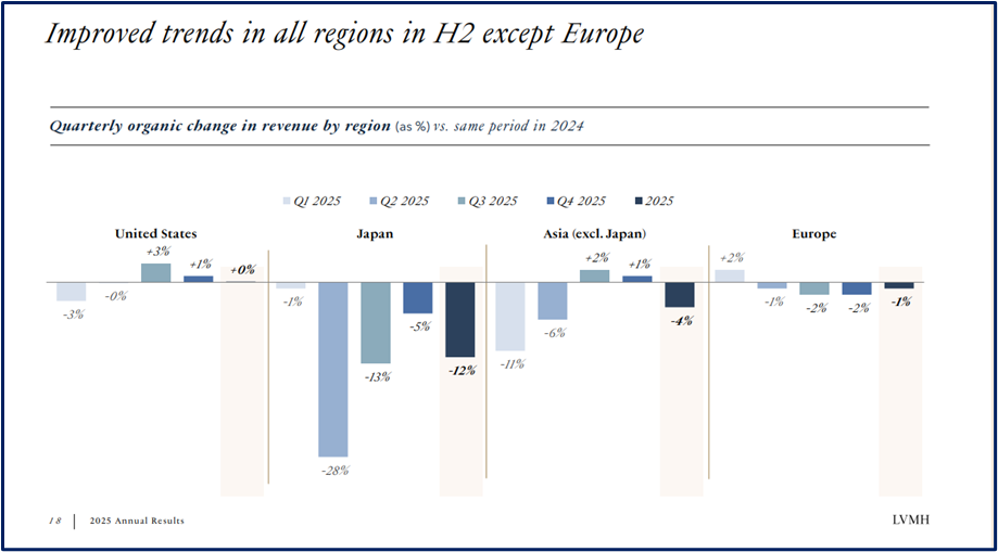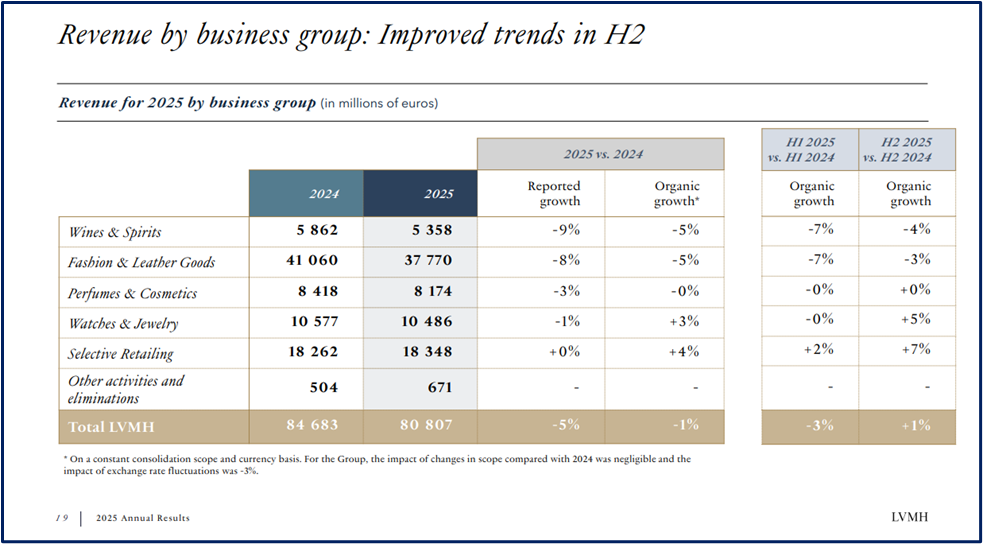 Within the business breakdown, the most important segment—Fashion & Leather Goods—generated negative -3% y/y growth for 2H25, which was an improvement over the first half of the year of -7% y/y.