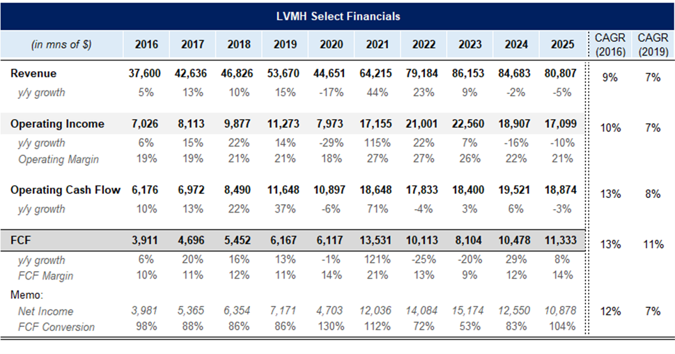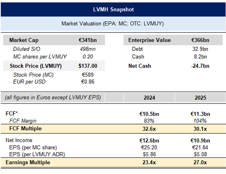 An investor will have to decide if they are comfortable paying today for a recovery and also assuming high single to low double digit operating income growth several years out into the future. On the other hand, they get a conglomerate of some of the most heritaged luxury brands that have a multi-decade history of continuing to grow earnings power (albeit with some cyclicality) that still trade 30% below their 2023 stock price.