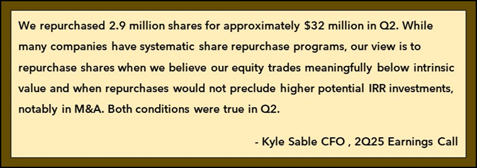 Their capital allocation continues to be superb. Perimeter deployed approximately $62mn in capital during the quarter. They will invest into 3 areas: internal capex, stock repurchases, and M&A, all of which they expect to generate a 15% or higher return on. Organic investments included $12.8 million in capital expenditures, primarily tied to production expansion in Fire Safety and Specialty. They repurchased 2.9 million shares for roughly $32 million, noting that they only opportunistically repurchase shares when they see a 15%+ IRR.