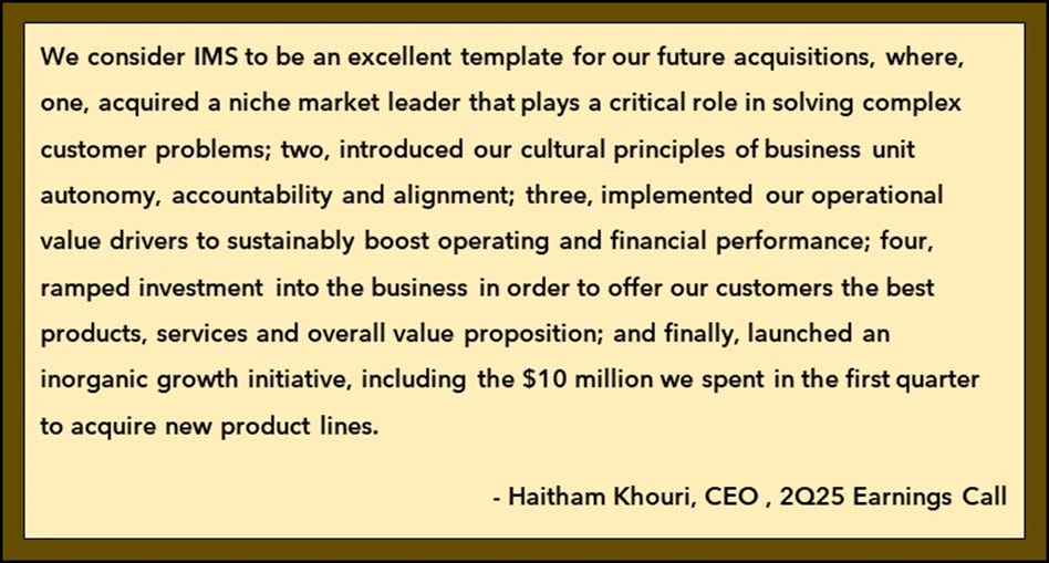 Their other segment, Specialty Products, is 26% of total revenues. Their +47% y/y growth in this segment was underpinned by their newly acquired IMS business, which contributed $9.3mn in revenues. As a reminder, back in December 2024, they acquired Intelligent Manufacturing Solutions (IMS) for approximately $33 million. IMS is a manufacturer of a highly specialized product called printed circuit boards or PCBs. Their attraction to this industry is partly because these PCBs are a relatively small cost component of a product and are critical to the function of the product. This was a platform acquisition that got them into this space.