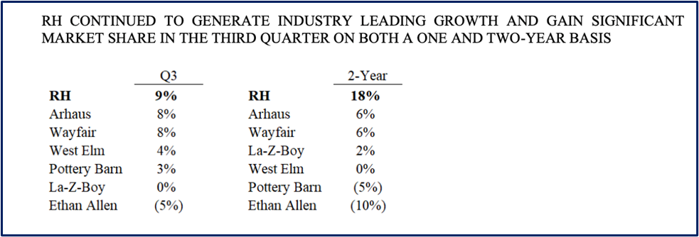 In the shareholder letter, they introduce a new table showcasing where RH is gaining market share from. While they have talked about competitors in the past, making a similar point of growth being higher than peers, this is the first time they put numbers around it. The inclusion of this table does make the shareholder feel like Gary has frustration with the stock price and investors not fully appreciating how tough of a market they have been operating in.
