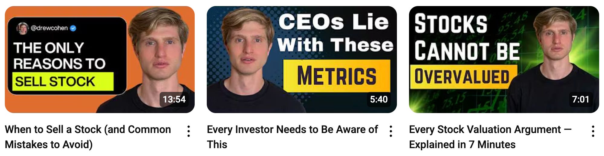 Check out Speedwell Research’s Drew Cohen’s YouTube Channel. It is focused on general investing and business content.