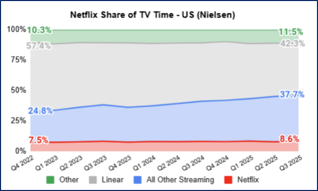 However, as streaming services emphasis advertising, a more pertinent metric going forward will be watch time on the platform—a metric that YouTube has long been number 1 in. At the end of 2024 Google announced that over 1 billion hours of YouTube were watched everyday. Netflix is estimated to be around a fifth of that at ~200 million daily watch hours. In their 3Q25 press release Netflix noted they increased their share of TV time to 8.6% from 7.5% in 4Q22. The more impressive move though came from Linear TV which fell from 57% to 42% in less than 3 years.
