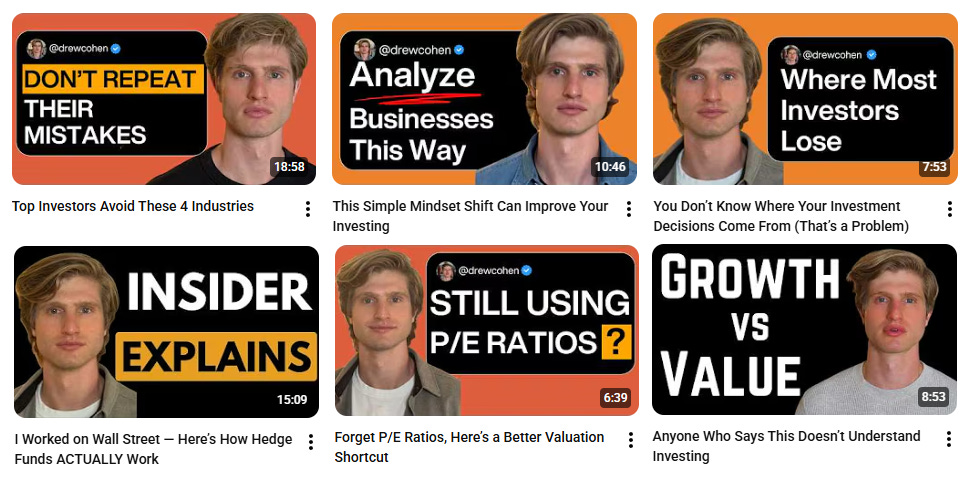 Check out Speedwell Research’s Drew Cohen’s YouTube Channel. It is focused on general investing and business content.