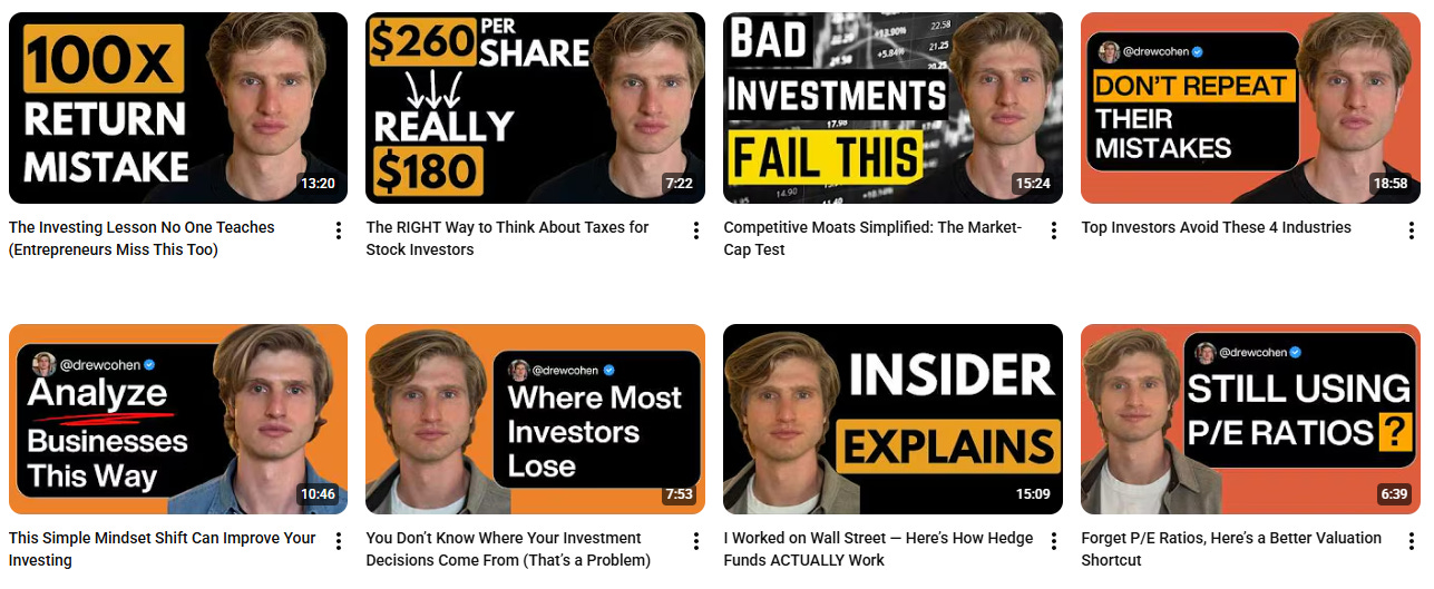 Check out Speedwell Research’s Drew Cohen’s YouTube Channel. It is focused on general investing and business content.