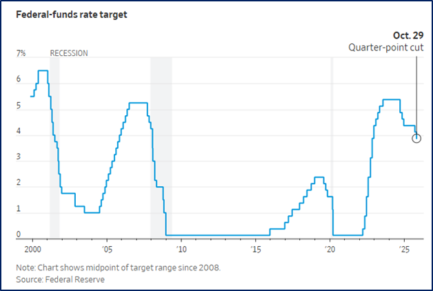 Turning to monetary policy, the Federal Reserve lowered interest rates for the second consecutive meeting, extending efforts to shield the economy from a slowdown in hiring. Yet Chair Jerome Powell moved swiftly to tamp down expectations that another cut in December is inevitable.