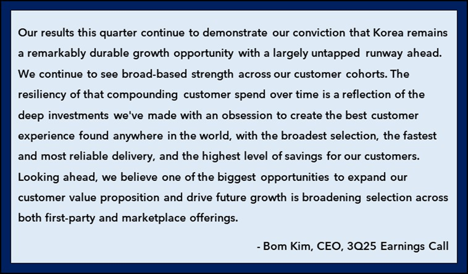 Increasing Selection: As we have long noted, Coupang just needs to simply increase selection in order to continue to increase spend per customer. This message was repeated by Bom Kim on the call when he emphasized “one of the biggest opportunities to expand our customer value proposition and drive future growth is broadening selection”.